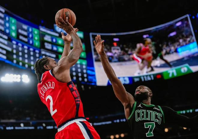 半場比賽戰(zhàn)罷,凱爾特人71-63領先快船8分。下半場比賽開始,易邊再戰(zhàn),倫納德低位轉身干拔跳投得手,揭開第三節(jié)比賽序幕,布朗罰球線干拔跳投立馬還擊一球,懷特手感火熱,突襲籃下后仰跳投再進一球,哈登油漆區(qū)飛身高拋上籃挑落兩分,倫納德加強進攻侵略性,到禁區(qū)內高舉高打制造殺傷,站上罰球線兩罰全中,克塔的一個平民上籃終結還以顏色,懷特的大號三分火速跳投長虹貫日,直墜籃心,科林斯飛身拋投擦板得手。眼看著快船就要追上比分,綠軍第三節(jié)末段一波小高潮再次打崩快船,布朗第三節(jié)單節(jié)轟出19分,三節(jié)比賽打完,凱爾特人113-99領先快船14分。