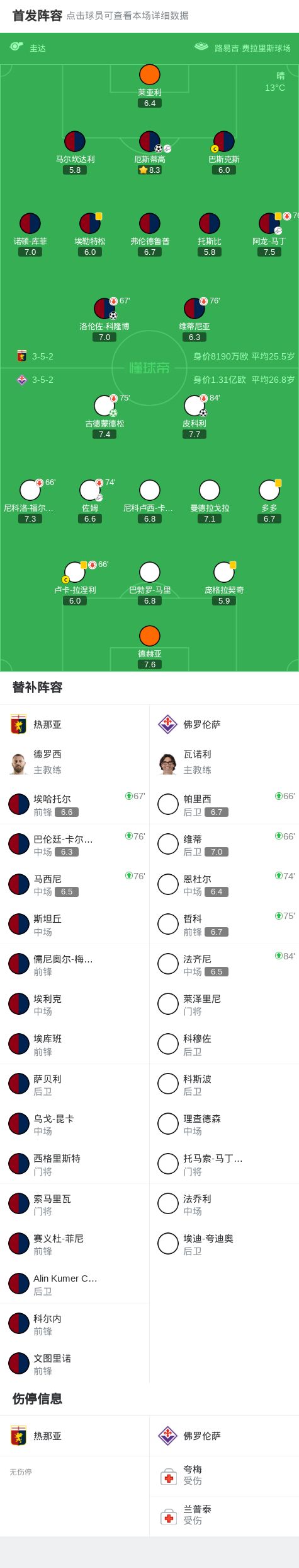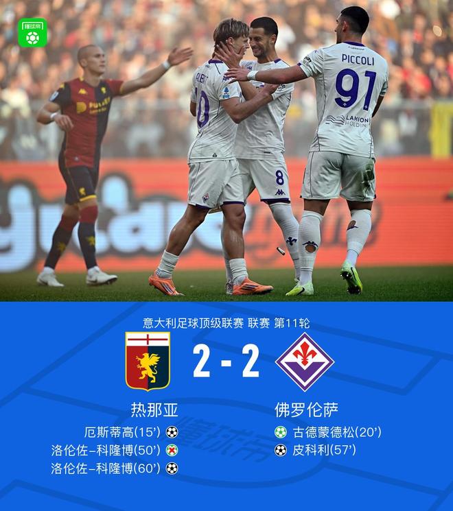 北京時(shí)間11月9日22:00,意甲第11輪展開(kāi)角逐,熱那亞坐鎮(zhèn)主場(chǎng)迎戰(zhàn)佛羅倫薩。比賽開(kāi)局階段,厄斯蒂高頭球破門(mén),古德蒙德松主罰命中,將比分扳平;下半場(chǎng)伊始,科隆博主罰點(diǎn)球被德赫亞撲出,隨后皮科利幫助球隊(duì)反超比分,但德赫亞失誤送科隆博攻入一球。最終比分定格在2-2,最終雙方握手言和,各取一分。