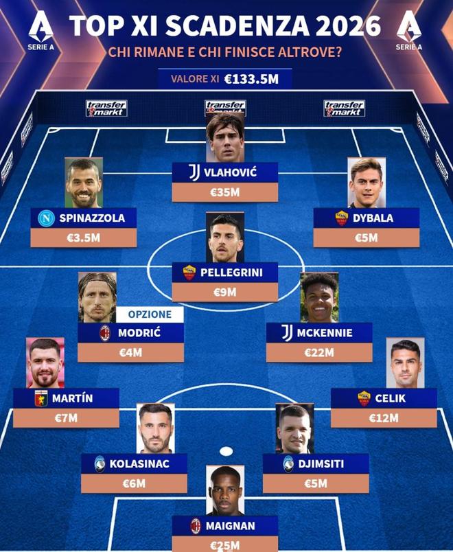 北京時間1月3日,德轉列出了意甲聯(lián)賽中現(xiàn)有合同今夏到期的最佳11人陣容,弗拉霍維奇、迪巴拉、莫德里奇以及邁尼昂在列。