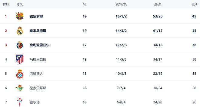 在積分榜上,巴薩依然高居榜首。巴薩的戰(zhàn)績是16勝1平2負(fù),拿到了49分。而贏球的皇馬緊隨其后,戰(zhàn)績是14勝3平2負(fù),拿到45分,以4分的劣勢排名第2。比利亞雷亞爾拿到38分,排名第3。戰(zhàn)平的馬競也是38分,排名第4。不過,馬競比比利亞雷亞爾多踢了2場比賽。西班牙人本賽季成績非常出色,拿到33分,排名第5?;始邑惖偎挂?8分排名第6。